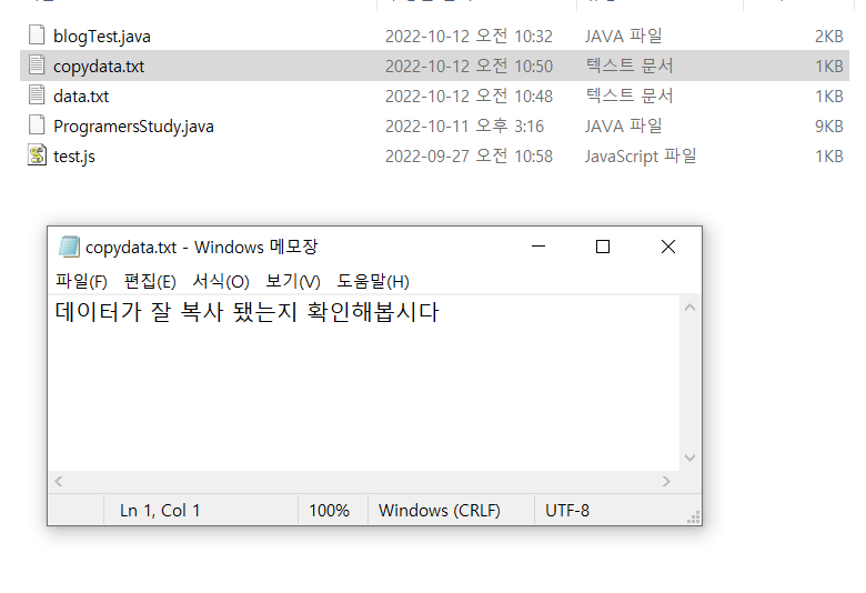 우리가 해볼것은 data.txt 내용을 byte 로 읽어서 copydata.txt 에 써보는거에요